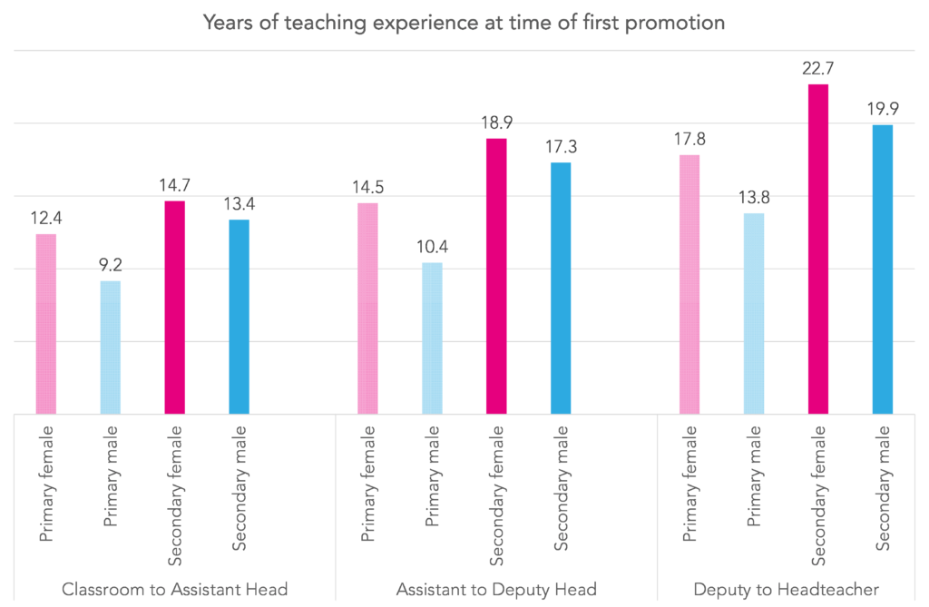Only a minority of teachers ever proceed to senior leadership positions. For example, in School Workforce Census in November 2016, for those with over 30 years of experience, 67% of men and 74% of women are still classroom teachers. However, as the chart below shows, men do make it into senior leadership posts at much higher rates than women.