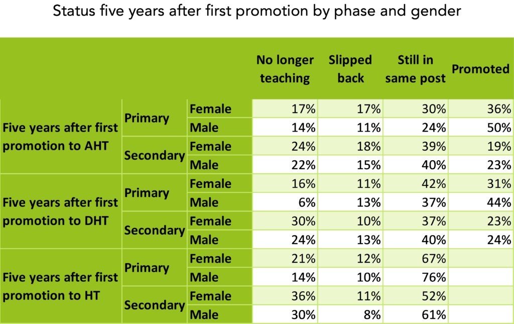 As we track what happens to these three cohorts achieving their first promotions to new posts, we find their roles five years later are quite different. In each case, the women are much less likely to have secured a further promotion, are more likely to have slipped back into a lower teaching post and are more likely to be no longer teaching in a state-funded school. This has a significant impact on the wage gap between male and female teachers.
