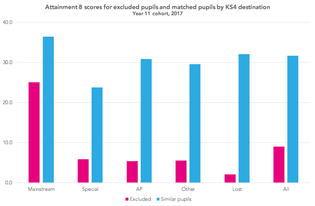 As would be expected, the Attainment 8 scores of excluded pupils were far lower than those of the pupils who were similar to them at the start of Year 7, regardless of where the pupils ended up in Year 11.