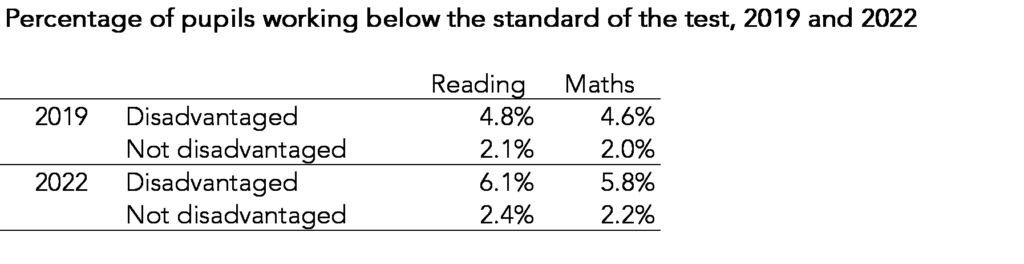 29.5% of the 2022 cohort was classified as disadvantaged, that is to say has been eligible for free school meals in the last 6 years. This compares to 30.5% the same as the last time the tests were sat in 2019. Perhaps a slightly surprising fall given the pandemic.