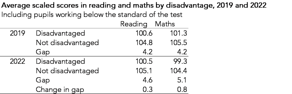 This shows a widening of the attainment gap of 0.3 points in reading and 0.8 in maths between 2019 and 2022.