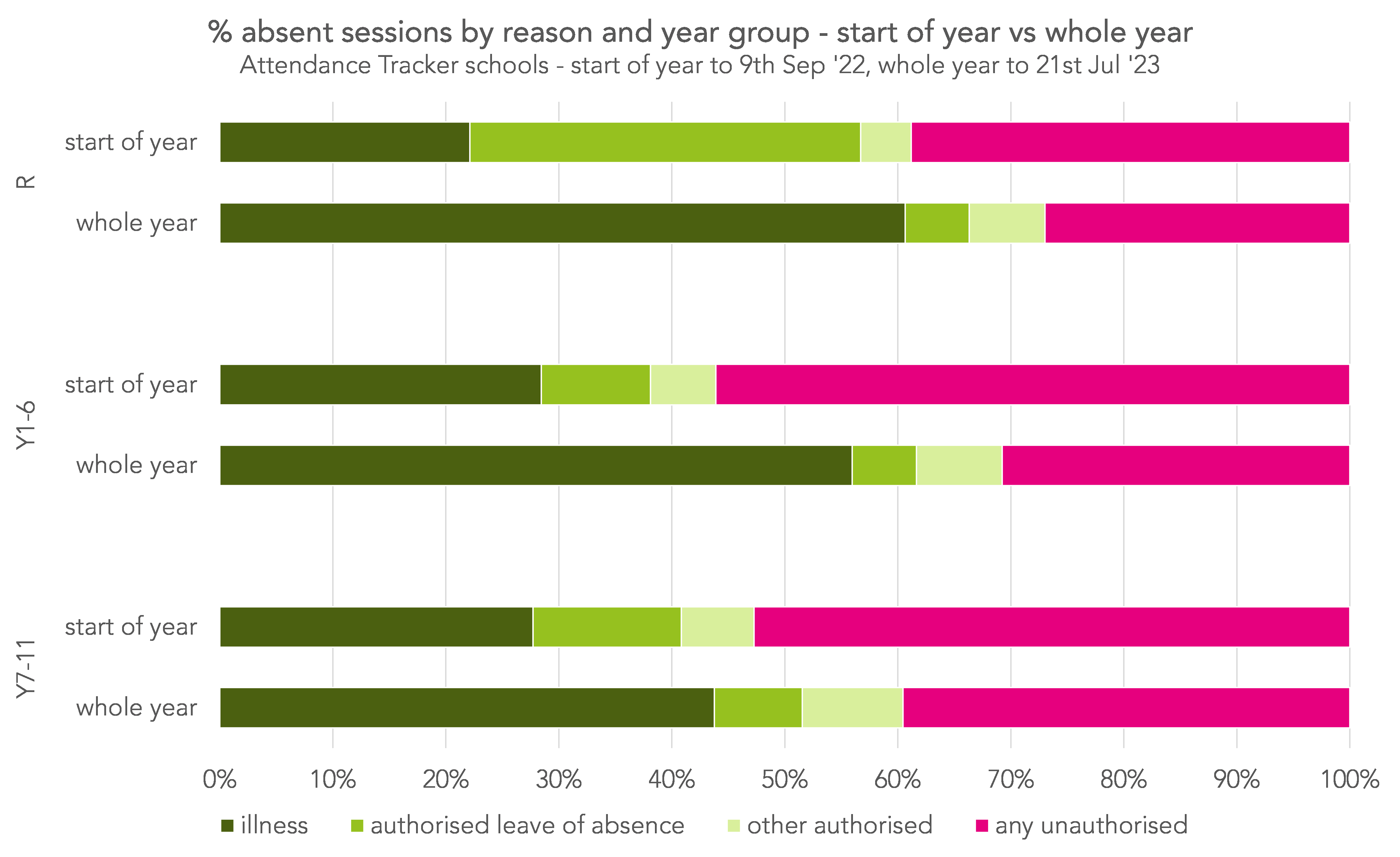 There was less absence recorded due to illness, and slightly more due to “authorised leaves of absence”. Pupils in Reception had much more absence of this type than those in other year groups at the start of the year – around 36% for Reception pupils compared with 10% for Year 1-6 and 13% for Year 7-11.