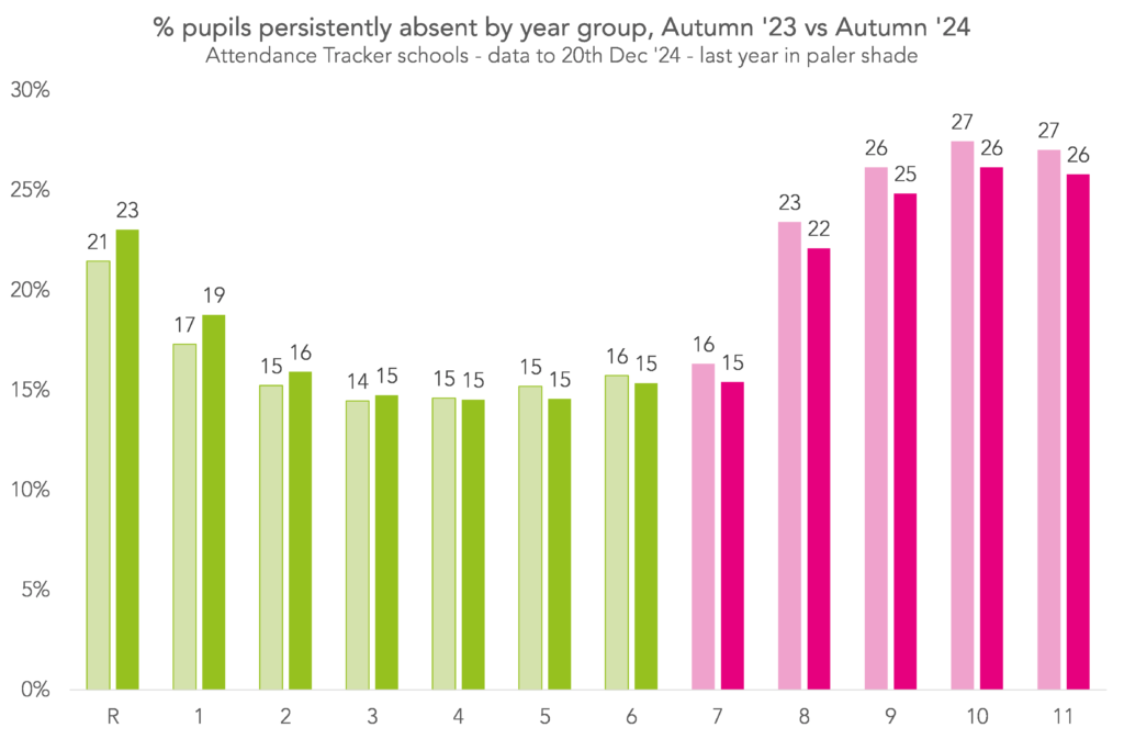 At primary, there has been little change since last Autumn, apart from for pupils in Reception and Year 1, where persistent absence seems to have increased a little.