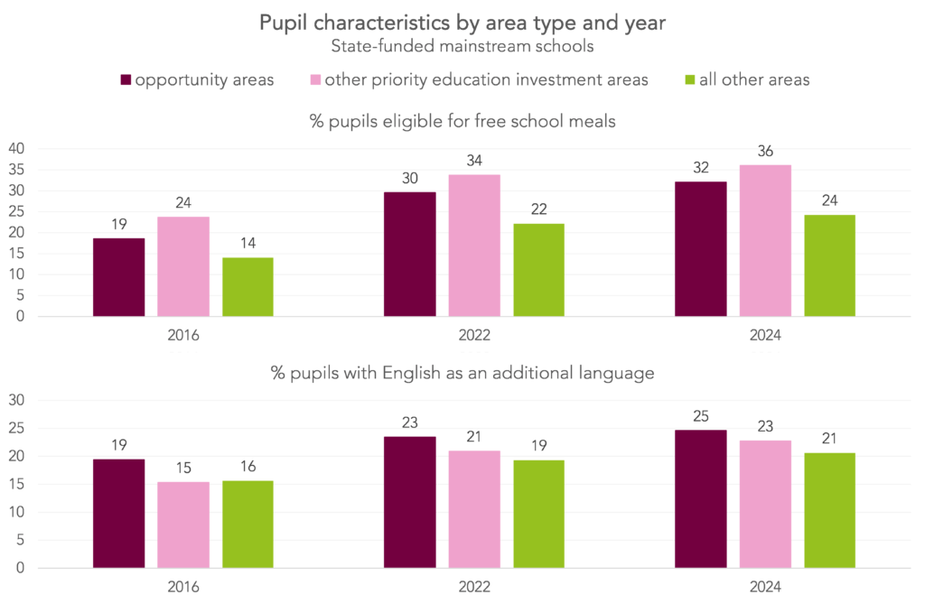 The biggest difference though is in the governance of mainstream schools. While the proportion of mainstream schools which were academies increased nationally between 2016 and 2024, there was a bigger increase in opportunity areas than elsewhere.