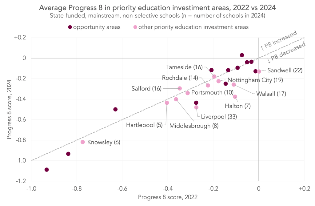 So we’ve seen that, as a group, both the original opportunity areas and the additional PEIAs saw their Progress 8 scores decrease slightly between the time they were identified and the most recent set of Key Stage 4 exams. But what happened in each area individually?