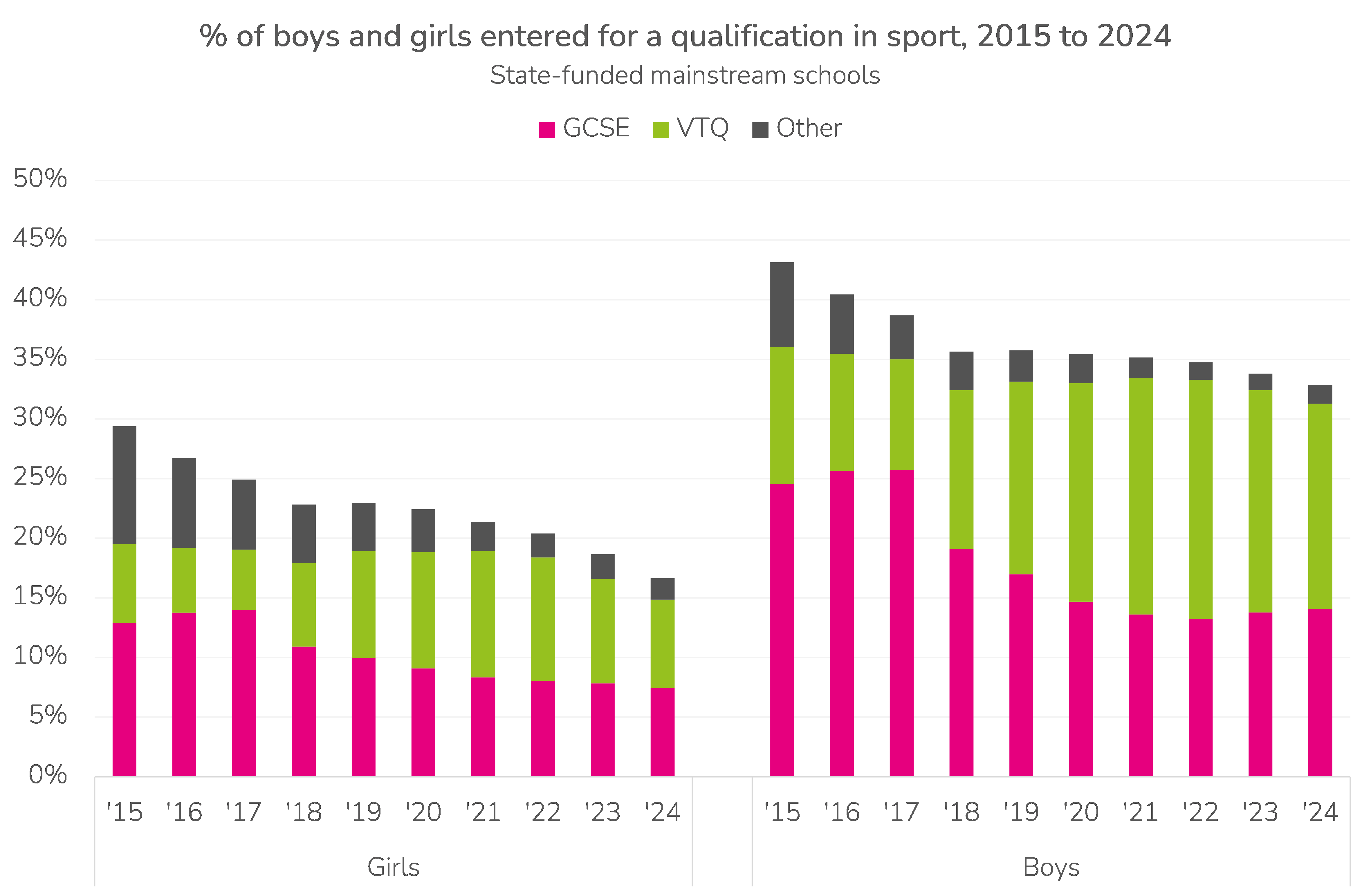 On the other hand, sport has gone somewhat under the radar. Entries in GCSE PE have actually been increasing over the last few years. However, this appears to be a function of a) a larger population of Year 11 pupils and b) a shift from VTQ qualifications to GCSE. This results in a progressively smaller proportion of the cohort taking sport, especially among girls (see Tables T1A and T1F of the appendix).