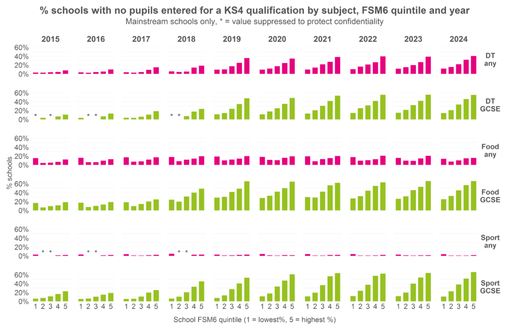 We repeat this analysis in the following chart, allocating schools to quintiles based on the percentage of Year 11 pupils who are disadvantaged[2]. We show the percentage of schools not offering D&T, sport and food and nutrition. We show entries in a) any qualification and b) GCSE only.