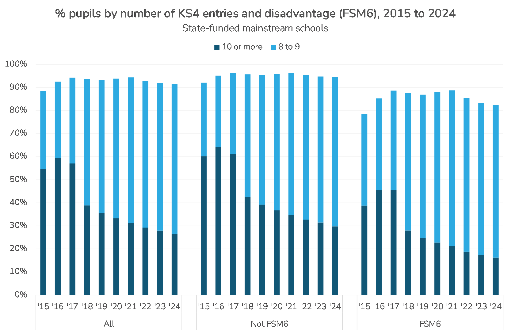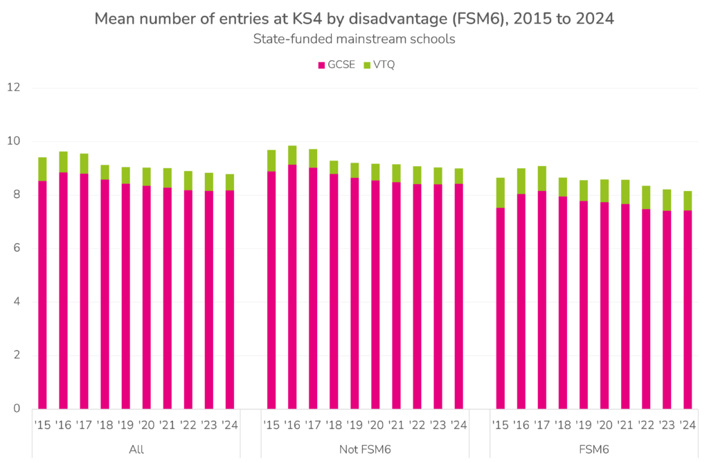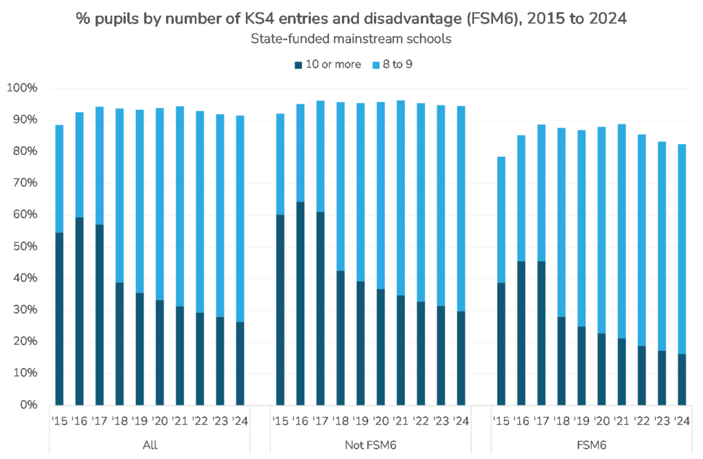 While over 90% of pupils are entered for at least 8 GCSEs or equivalent, the proportion entered for 10 or more has fallen from 59% in 2016 to 26% in 2024. This raises the question, which we are not going to answer, of how many qualifications is the right amount.