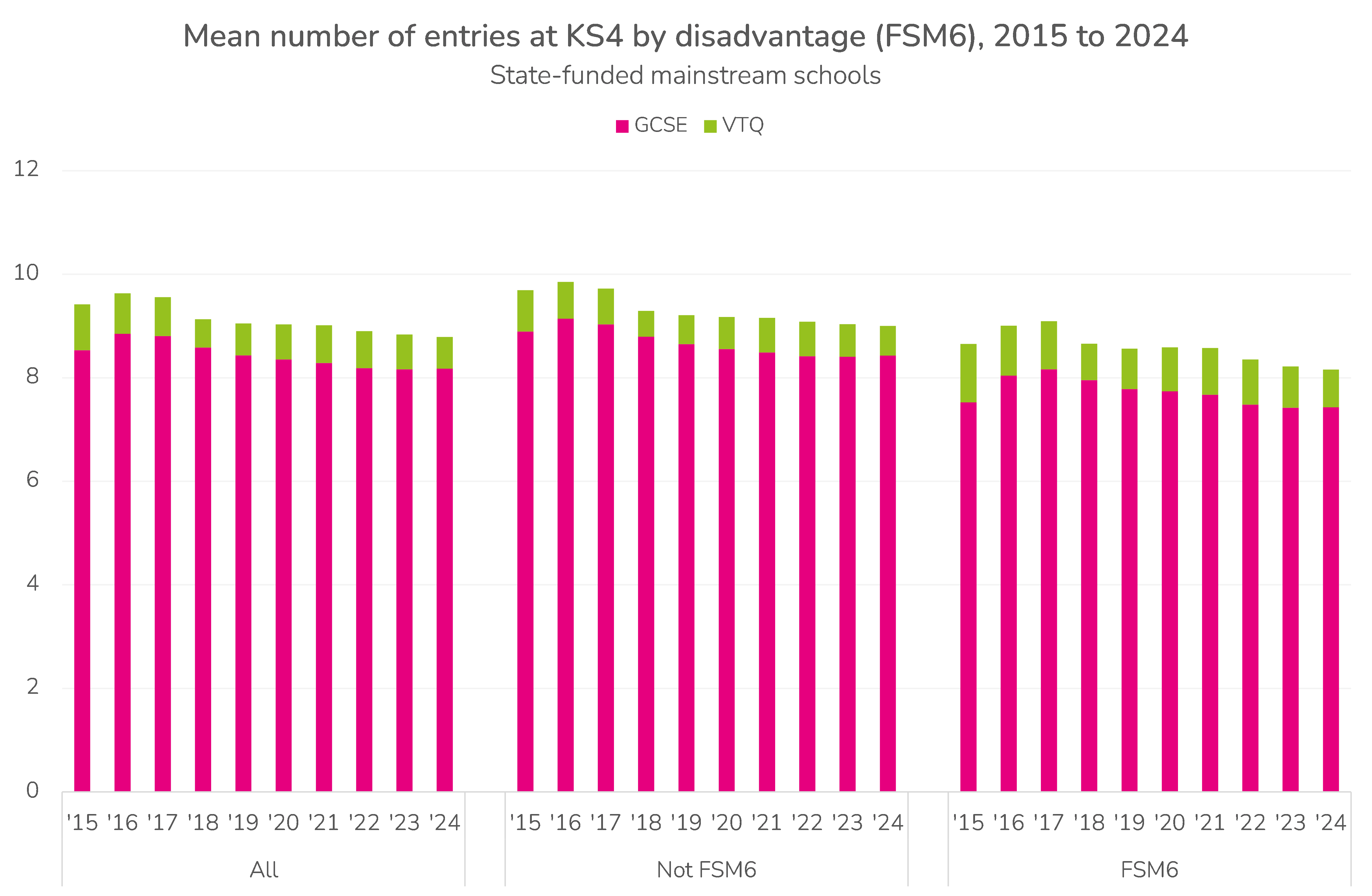 On average, pupils entered 8.8 qualifications (8.2 in GCSEs, 0.6 in VTQs) in 2024, down from 9.6 in 2016.