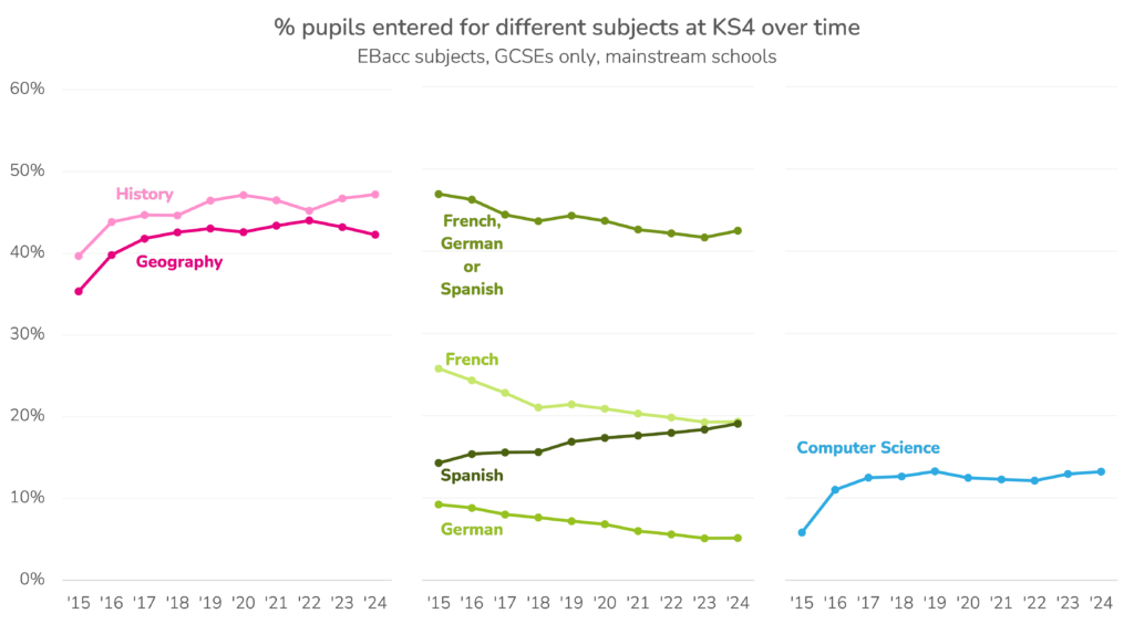 Intriguingly, entries in history have tended to be slightly higher than geography. We note that history entries fell between 2020 (when exams were replaced with centre assessment grades) and 2022 while geography entries increased. Since 2022, history entries have increased and geography entries have fallen.