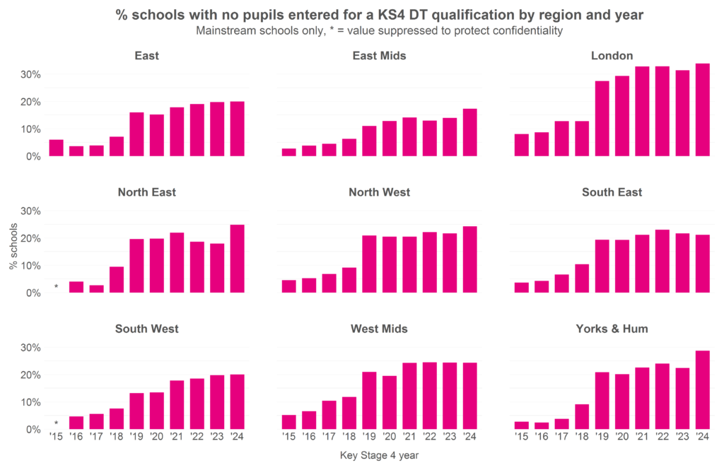 We provide a table of the number of schools not offering each subject in Table T5 of the appendix. London is the now the region with the highest percentage of schools not offering D&T.