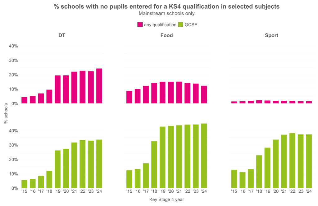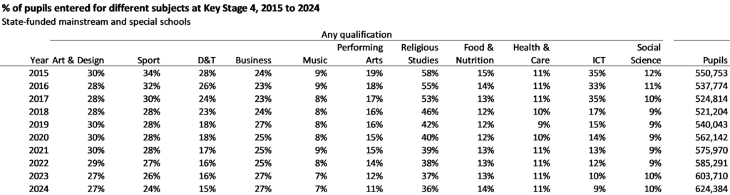 The impact of this reduced offer has been felt in some subjects more than others, notably D&T, ICT, religious studies and PE/ sport. Numbers of schools not offering these subjects at all have risen.