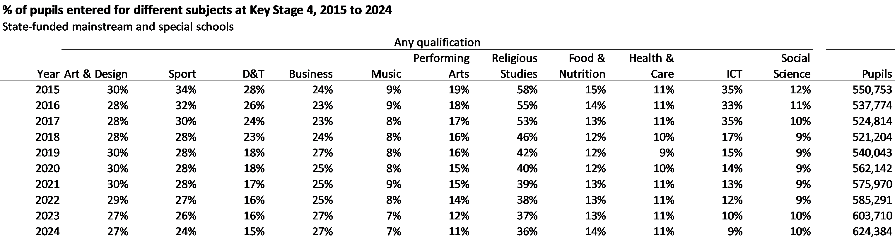 The decline in D&T is a long-standing trend. ICT has declined as a result of a) the lack of a reformed GCSE, b) the introduction of computer science and c) the removal of the European Computer Driving Licence (ECDL) from Performance Tables. Religious studies had previously been a growing subject.