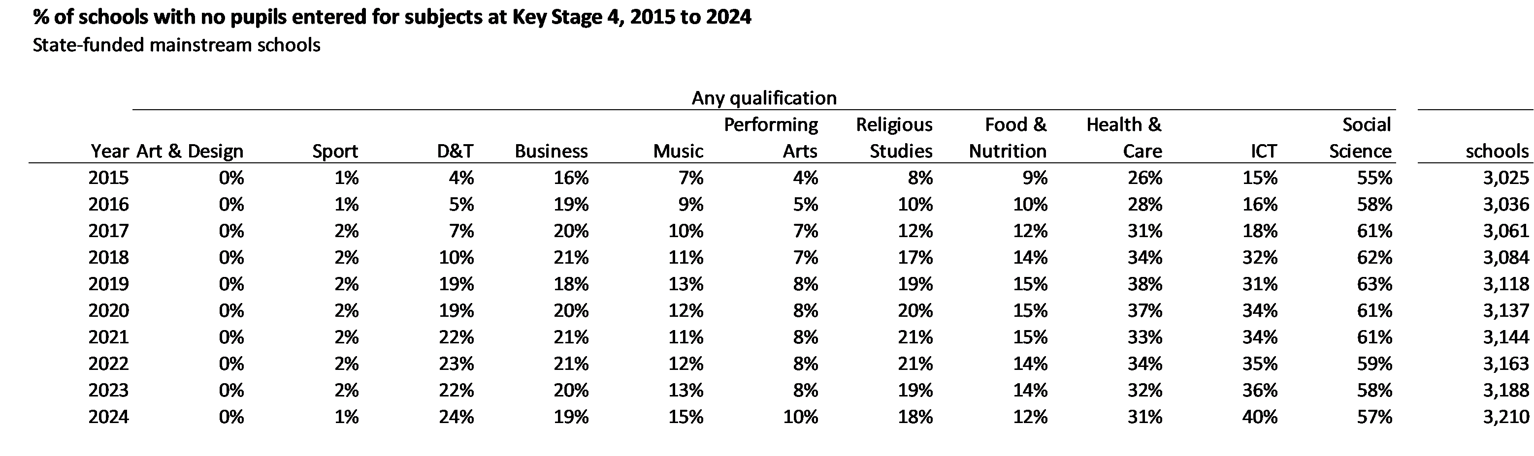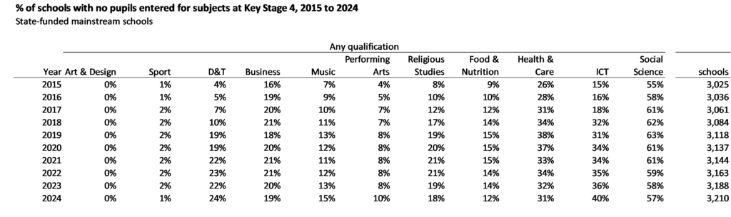 The table below shows the percentage of state-funded mainstream schools (of which there are around 3,200) without any entrants in each subject group each year.