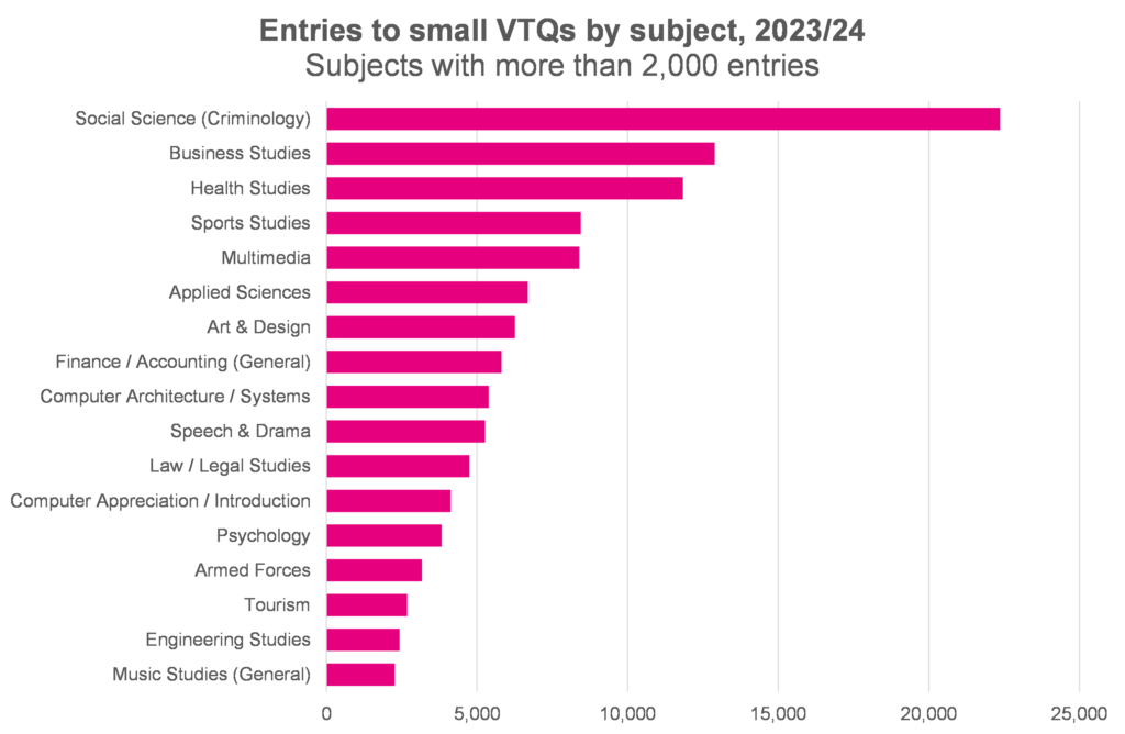 The most popular subject shown on the chart, social science, actually includes just two small VTQs, the WJEC Applied Diploma and Applied Certificate in Criminology. Other popular topics include business studies, health studies, multimedia and sports studies.