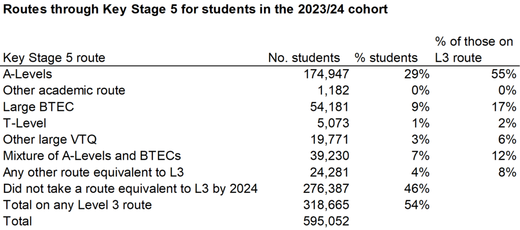 Here we’ve broken 2024 students down into three groups: those who took A-Levels or another academic route, those who took large VTQs (including T-Levels) and those who took small VTQs in some combination. The third group are the 64,000 identified above as those most likely to be a good fit for V-Levels.