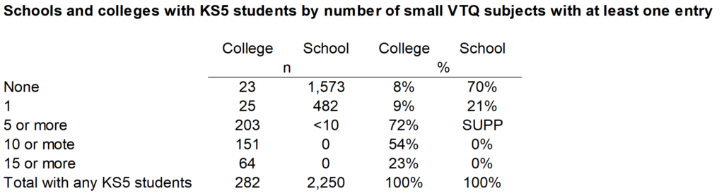 The majority of schools with Key Stage 5 students didn’t have any students entered for small VTQs. Those that did had entries in a very limited number of subjects, the majority just one. In contrast, the vast majority of colleges had entrants to small VTQs, and most had entrants in a range of subjects, with the majority offering ten or more.