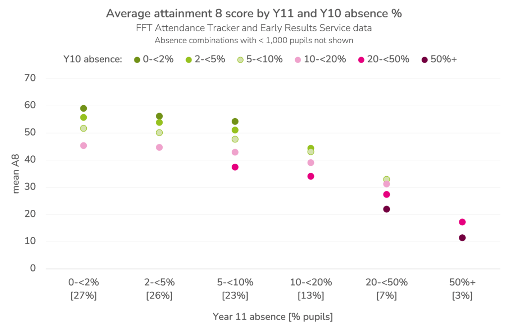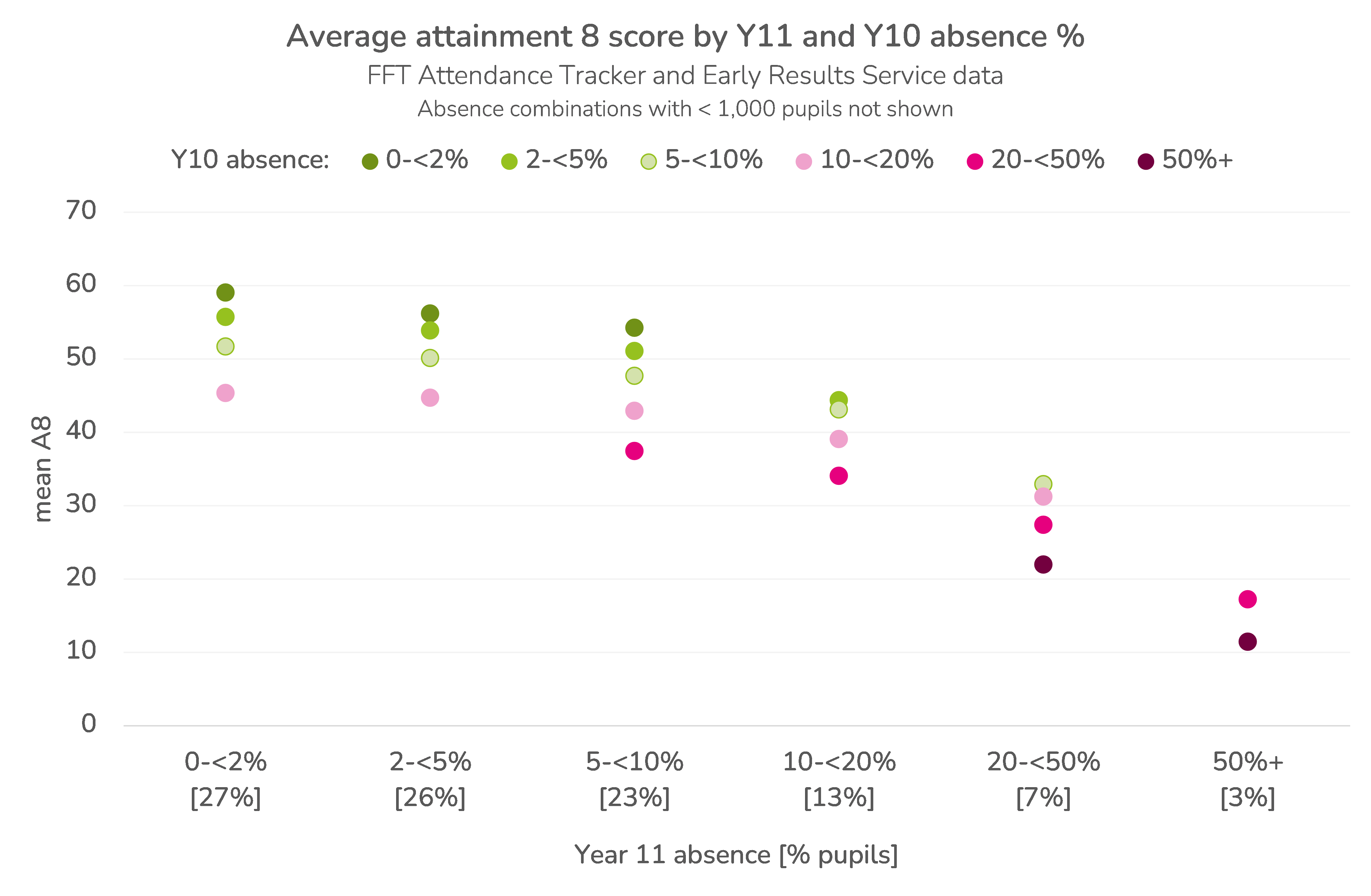 There are a few interesting patterns to unpick. The first is that when we focus on each set of coloured dots separately, we don’t see Attainment 8 scores drop by as much with each increase in Year 11 absence as we saw when we looked at the relationship in the overall population. For example, for those who missed less than 2% of sessions in Year 10 (the darkest green), Attainment 8 varied from 59.1 for those who missed less than 2% of sessions in Year 11 to 54.3 for those who missed between 5 and 10%, a difference of just under 5 points, or half a grade. This is around half the difference between these two absence groupings in the Year 11 population overall. That said, the relationship doesn’t disappear completely.