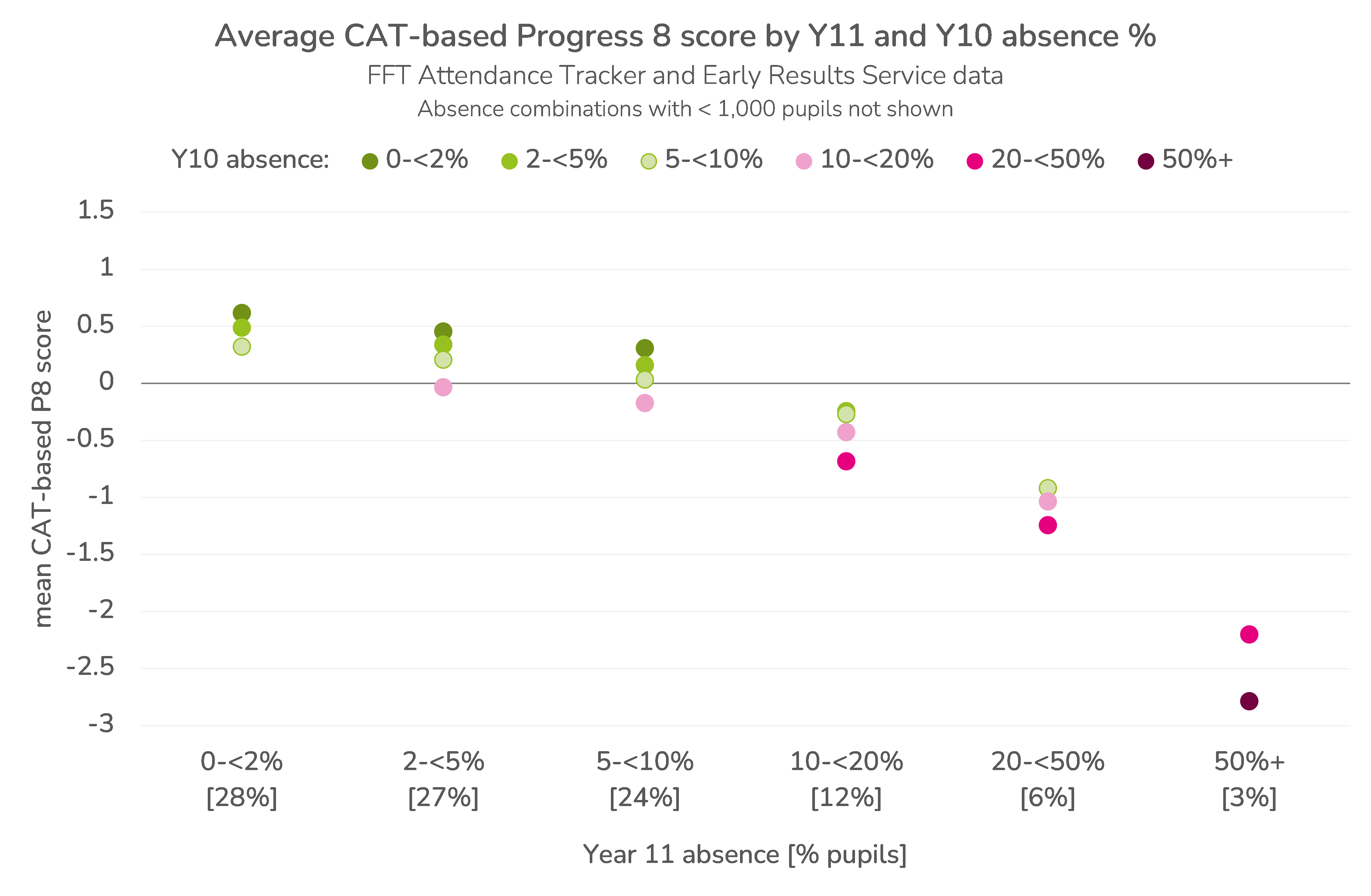 Hi Mike. The patterns overall are pretty similar in both versions. As in, we see both A8 and CAT4-based-P8 decrease with each increase in Y11 absence, but the decrease becomes less pronounced when we account for Year 10 absence (CAT4-based-P8 version available here). The relationship is slightly weaker in the P8 version, which makes sense because we’d expect absence and baseline attainment to be negatively correlated. We’d need to do some further work to answer your question fully though, not least bringing in absence rates in earlier years.