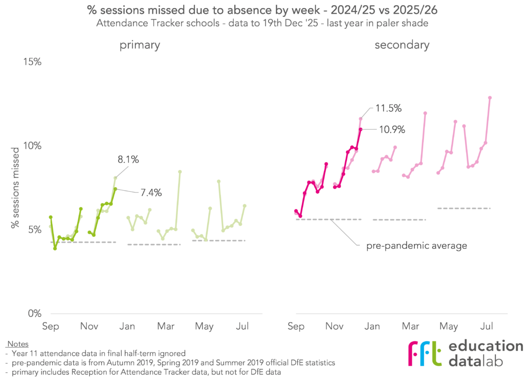 Perhaps surprisingly, the earlier peak in illness-related absence this year hasn’t translated into a substantial increase in absence across the term as a whole.
