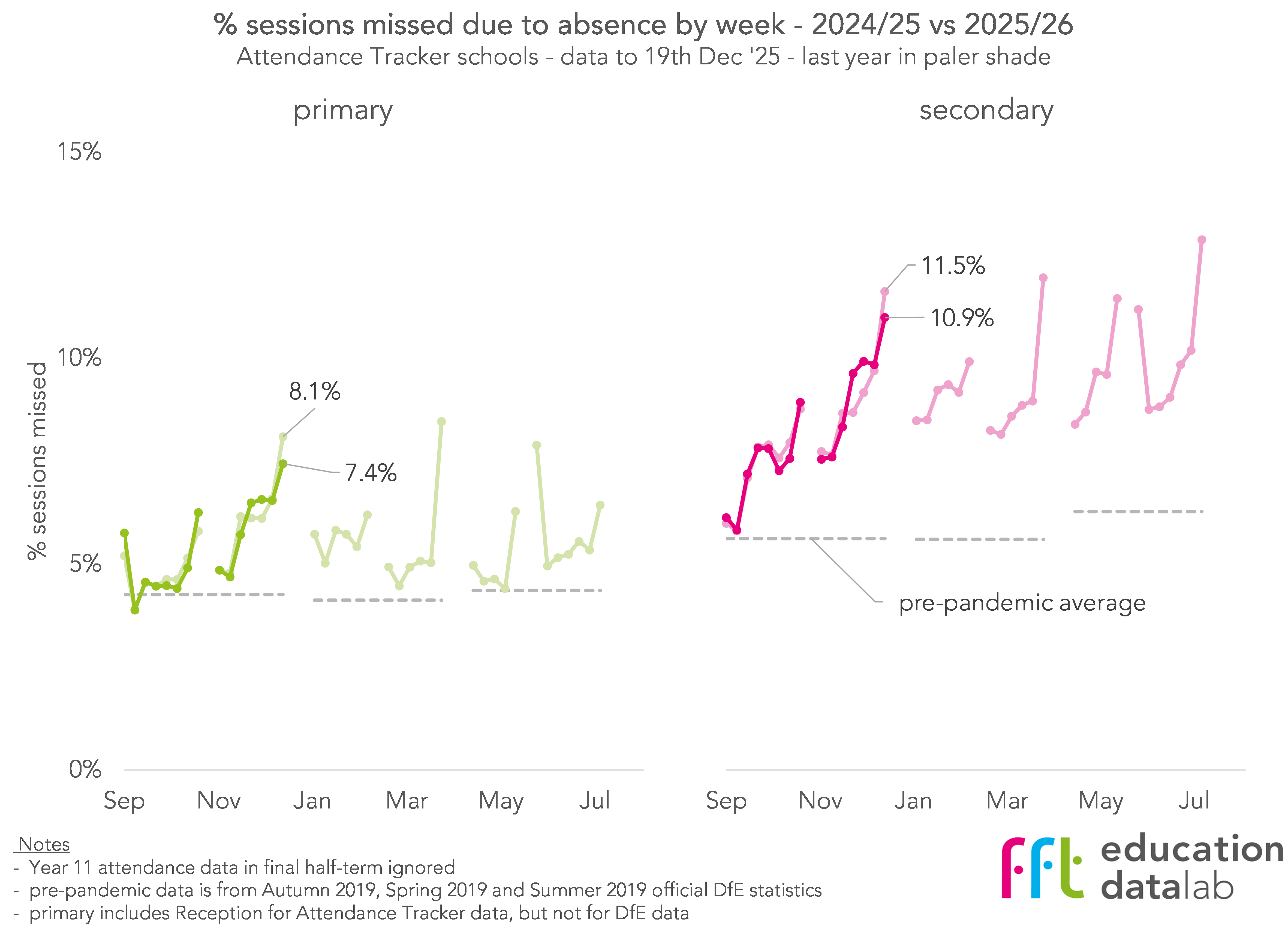 At secondary, the contrast with last year, where illness-related absence increased gradually through the term and peaked just before Christmas, is clear. It is less clear at primary, where there appear to have been two peaks last year: one at the end of November and a second in the week before Christmas.