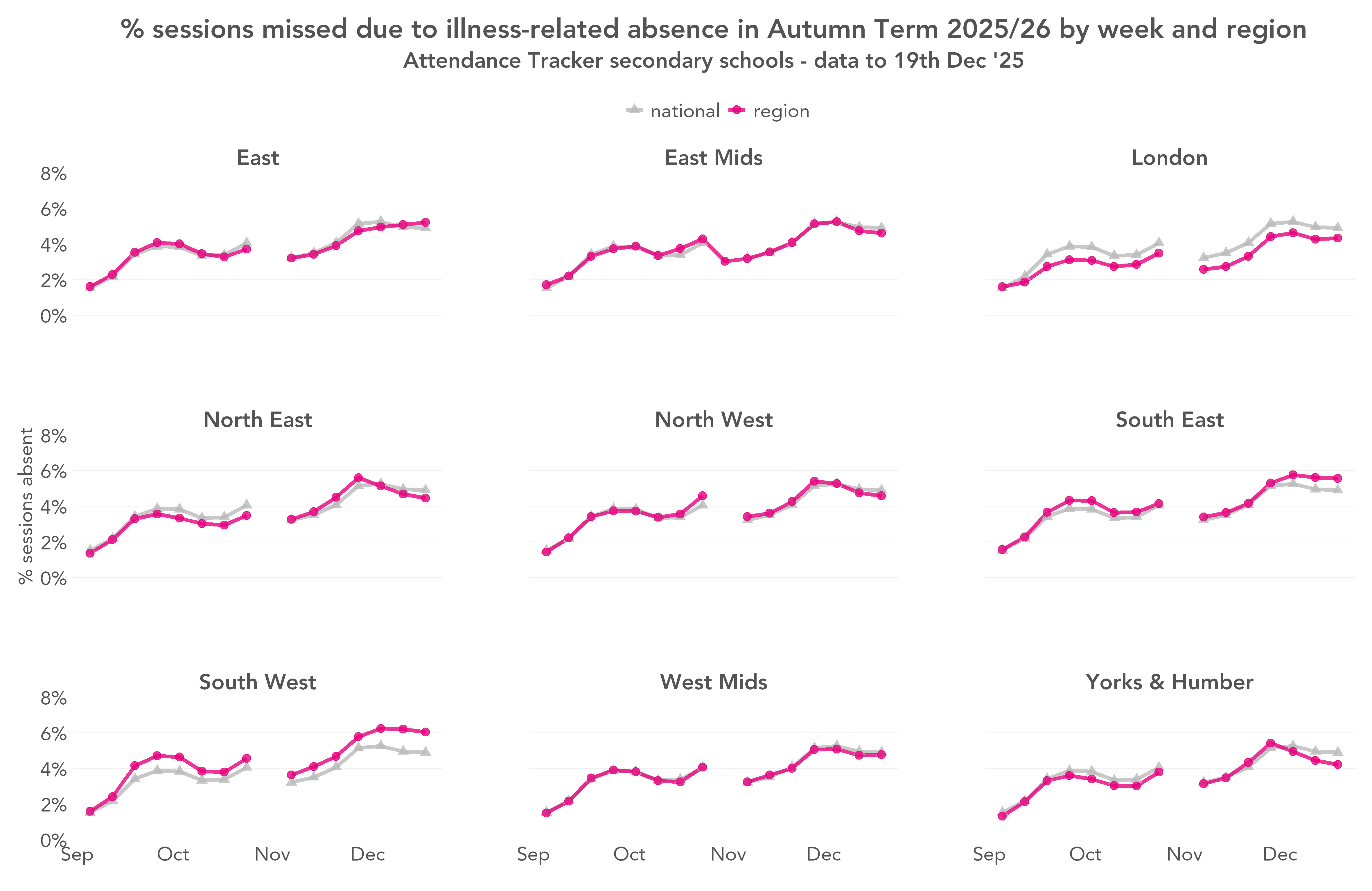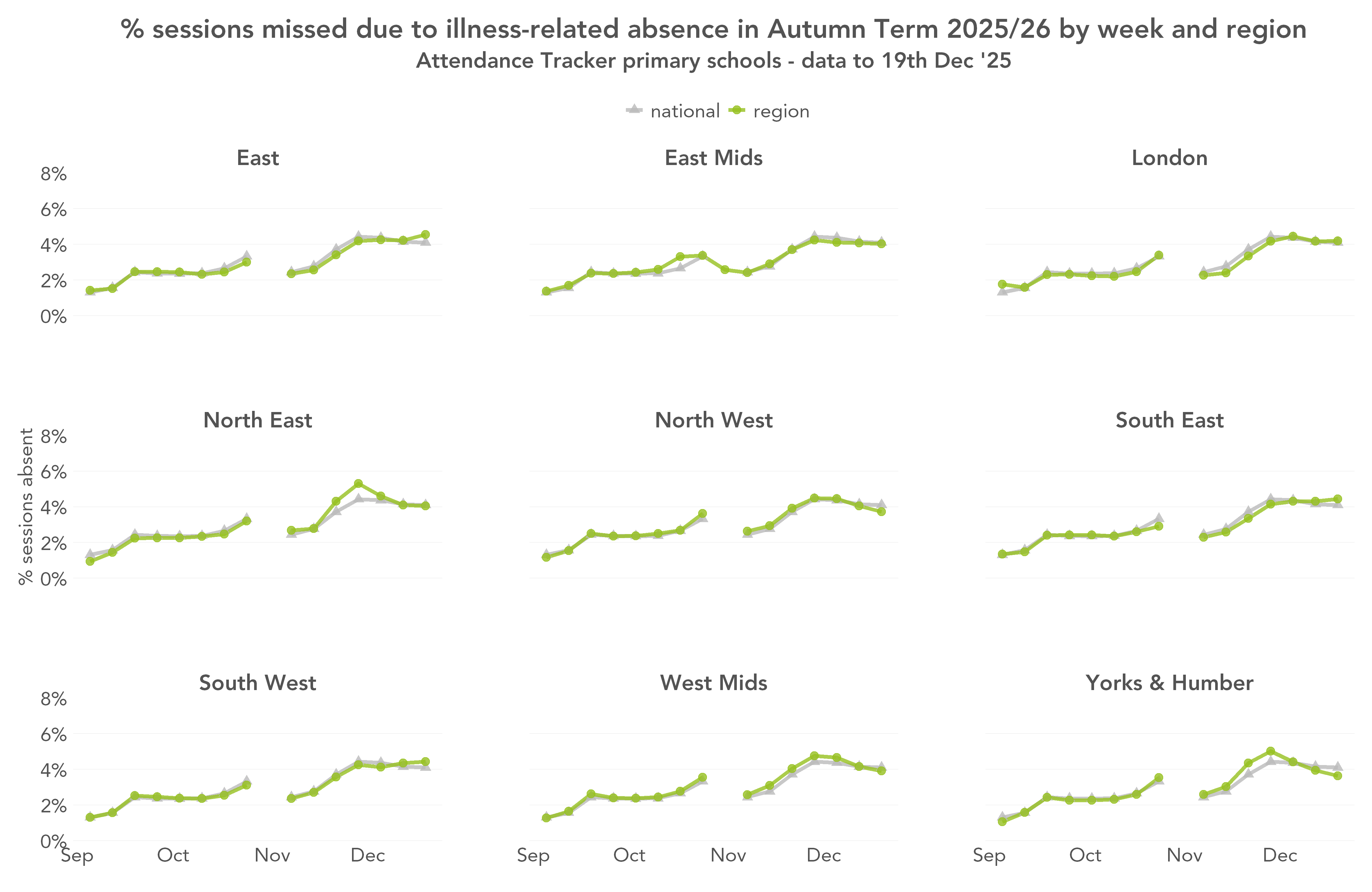 To see whether the early peak this year was a national phenomenon, or driven by certain areas, we plot the percentage of sessions missed due to illness-related absence by region, and compare with the percentages nationally. First, primary: