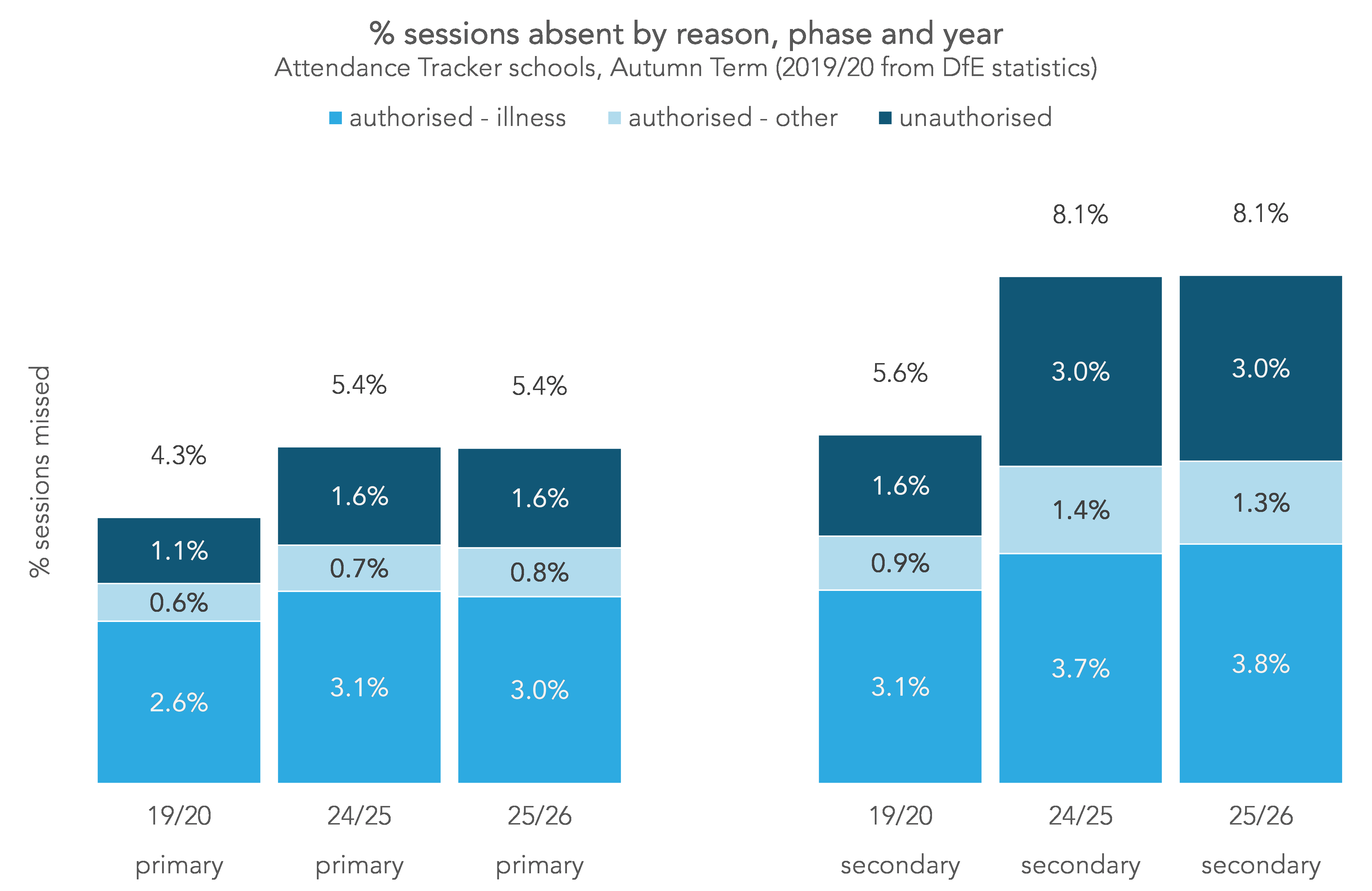 Next, let’s look to see whether the different pattern of illness-related absence this year have impacted the overall rates of absence across the term. Below, we plot the percentage of sessions missed this Autumn Term compared with last, and with Autumn Term 2019, broken down by the reasons recorded in schools’ registers.