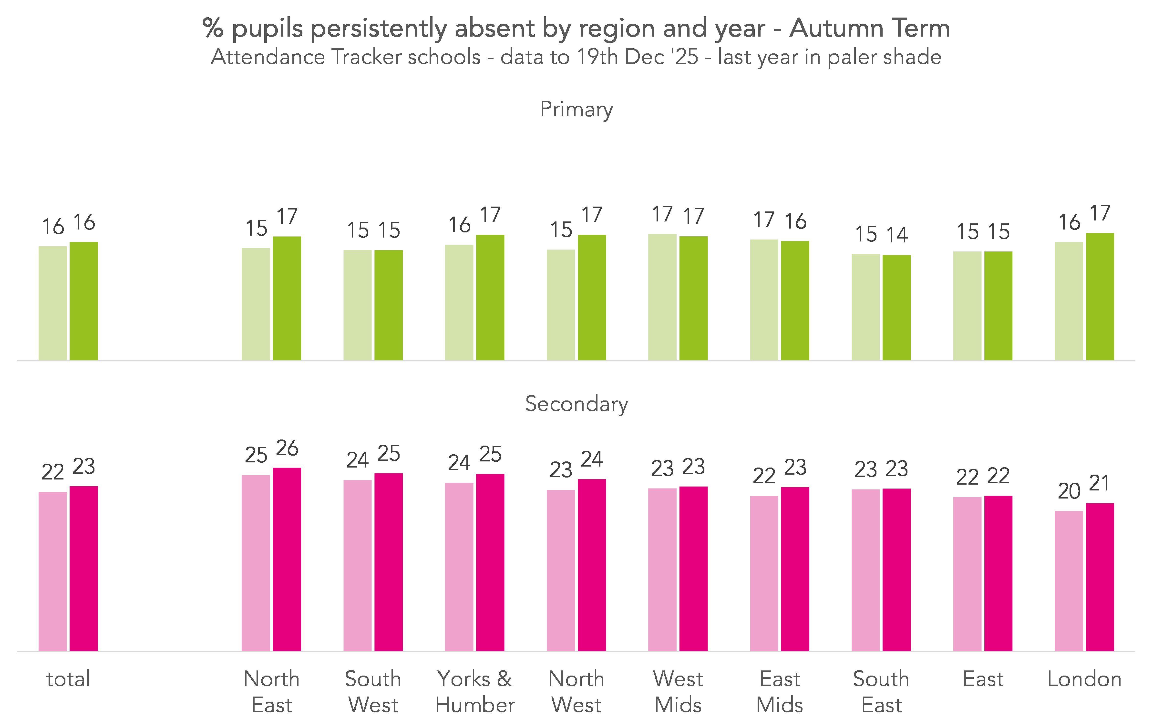 Rates of persistent absence are broadly similar this year compared with last year. Where there have been changes, they have been small. The largest change by region was at primary in the North West, where there was a 2 percentage point increase.