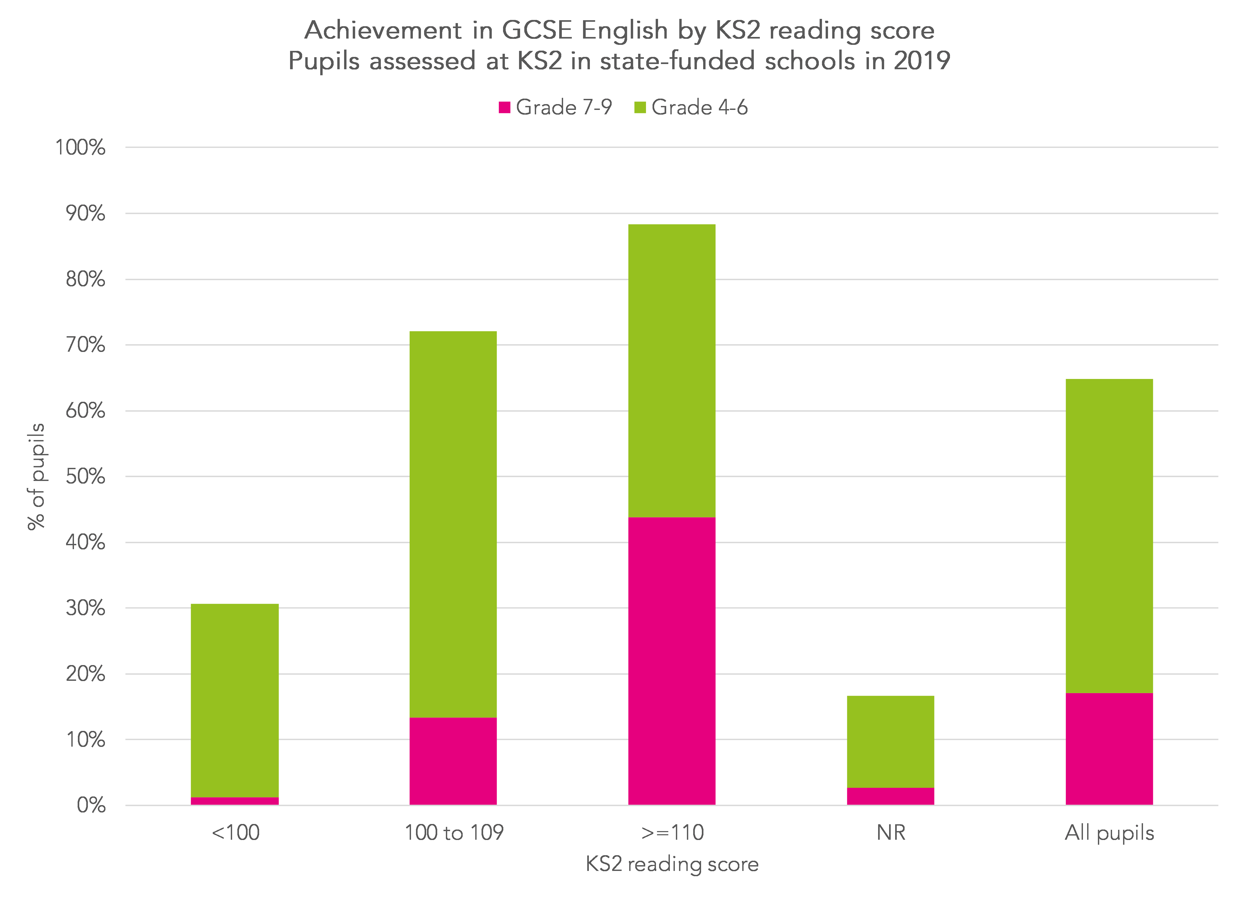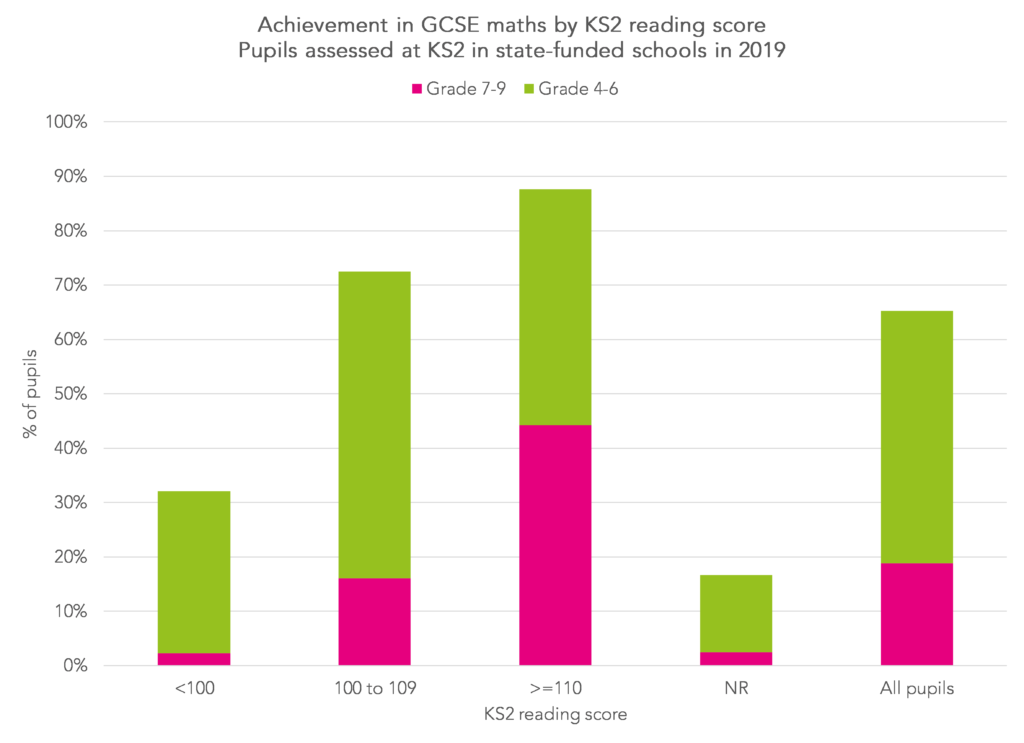 It doesn’t automatically follow that achieving a score below 100 in KS2 reading results in poor outcomes. 1% of pupils who did so in 2019 subsequently went on to achieve grade 9-7 in GCSE English. However, the majority do not go on to achieve grades 9-4.