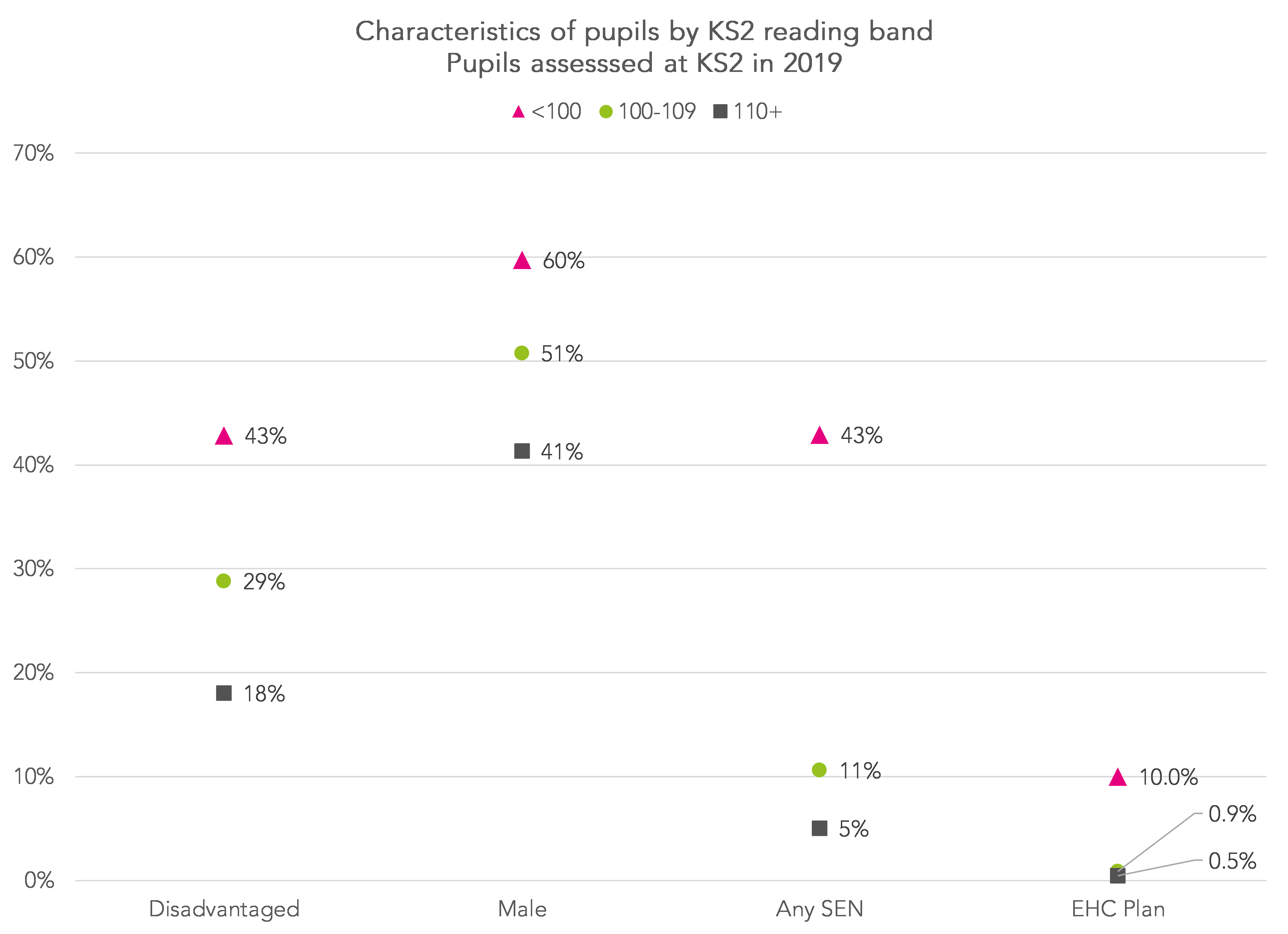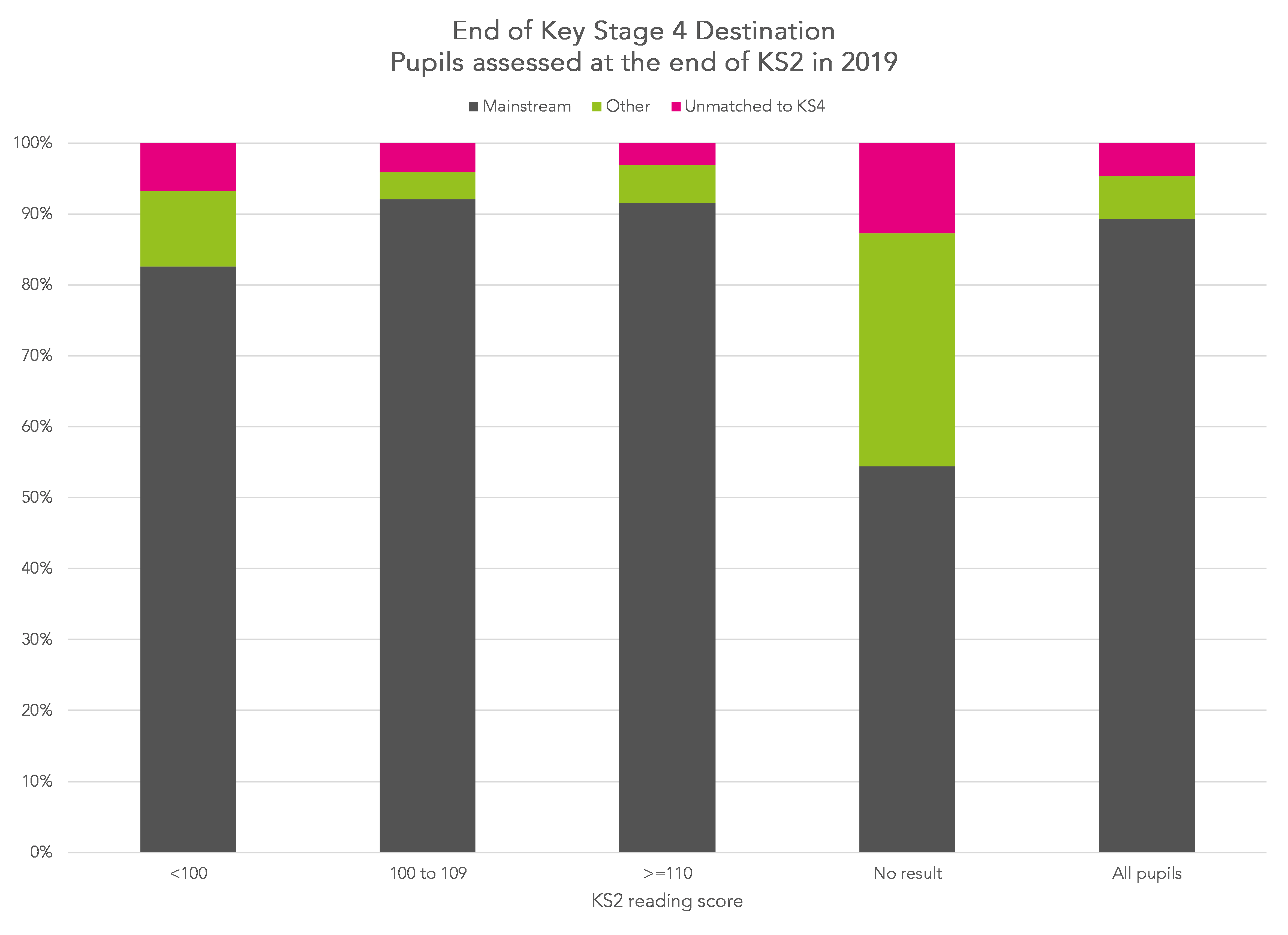 In 2019 around 26% of pupils achieved a Key Stage 2 reading score below 100 although the outcomes of those who score exactly 100 tend to be only slightly better than the outcomes of those who score 99.