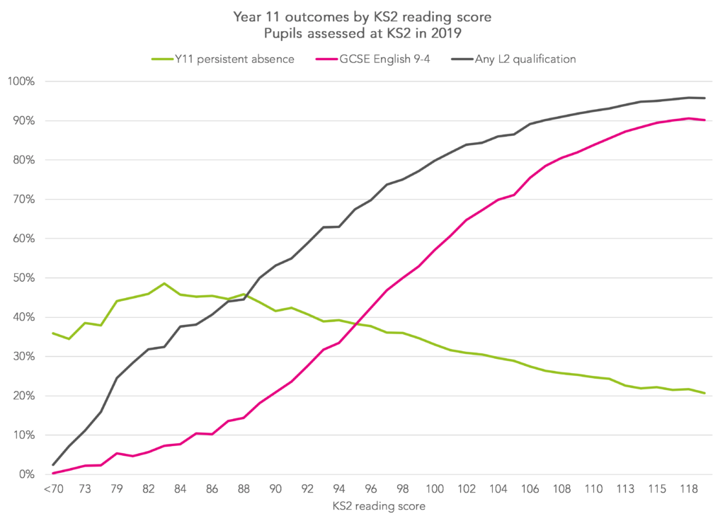 In the chart below we look at how three outcomes vary with respect to Key Stage 2 reading score: GCSE English grade, achievement of a Level 2 qualification and persistent absence in Year 11.