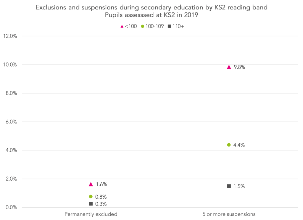 1.6% with a KS2 reading score below 100 were subsequently permanently excluded and almost 10% were suspended at least 5 times between Year 7 and Year 11.