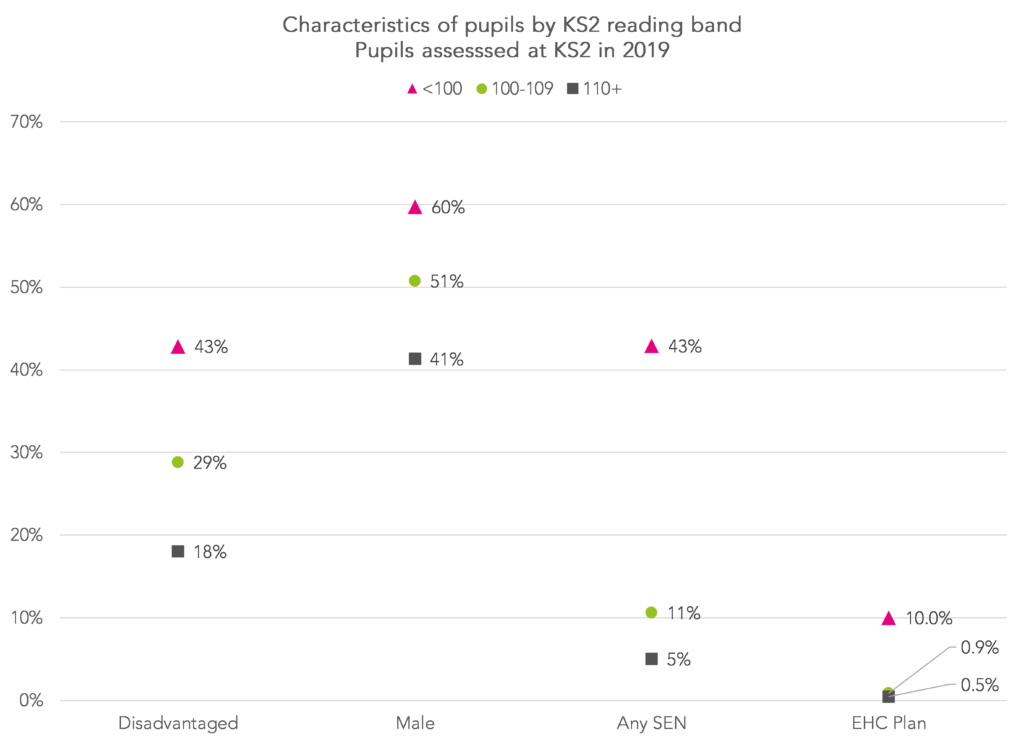 Firstly, it’s worth underlining that low reading attainment at Key Stage 2 is associated with disadvantage and special educational needs (SEN). The causes of poor outcomes at the end of secondary school will be multifactorial.
