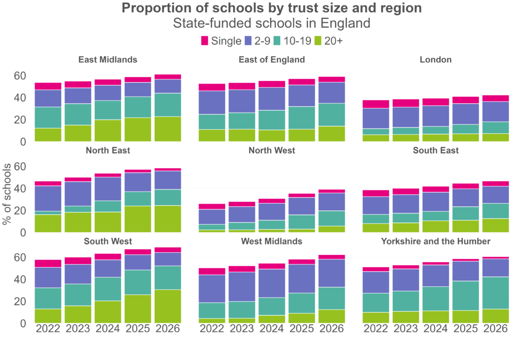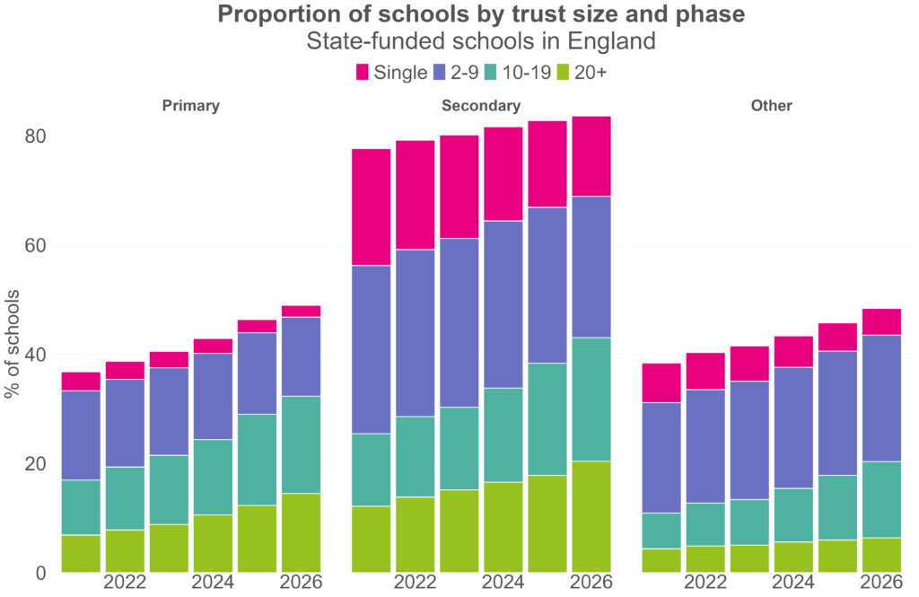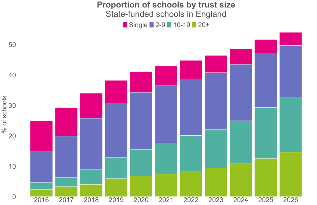 The trends over the last few years have been familiar in some ways: more schools have been joining academy trusts, and trusts have been getting bigger. But one difference since 2022 is the number of schools in smaller trusts – those with less than ten schools – has been falling. This is likely a reaction to the then government’s commitment to bring all schools into large trusts.