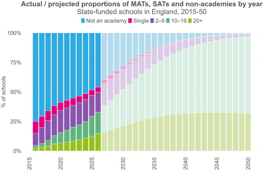 The chart below show the actual and predicted proportions of schools in MATs by size and year, up to 2050.[1]
