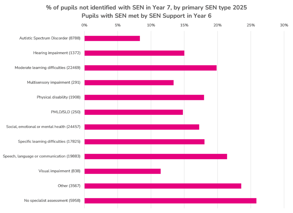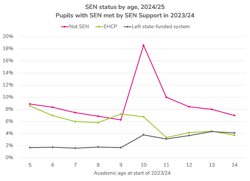 Firstly, around 19% of pupils identified with SEN met by SEN support in 2023/24 ceased to be identified as having SEN when moving to secondary school.