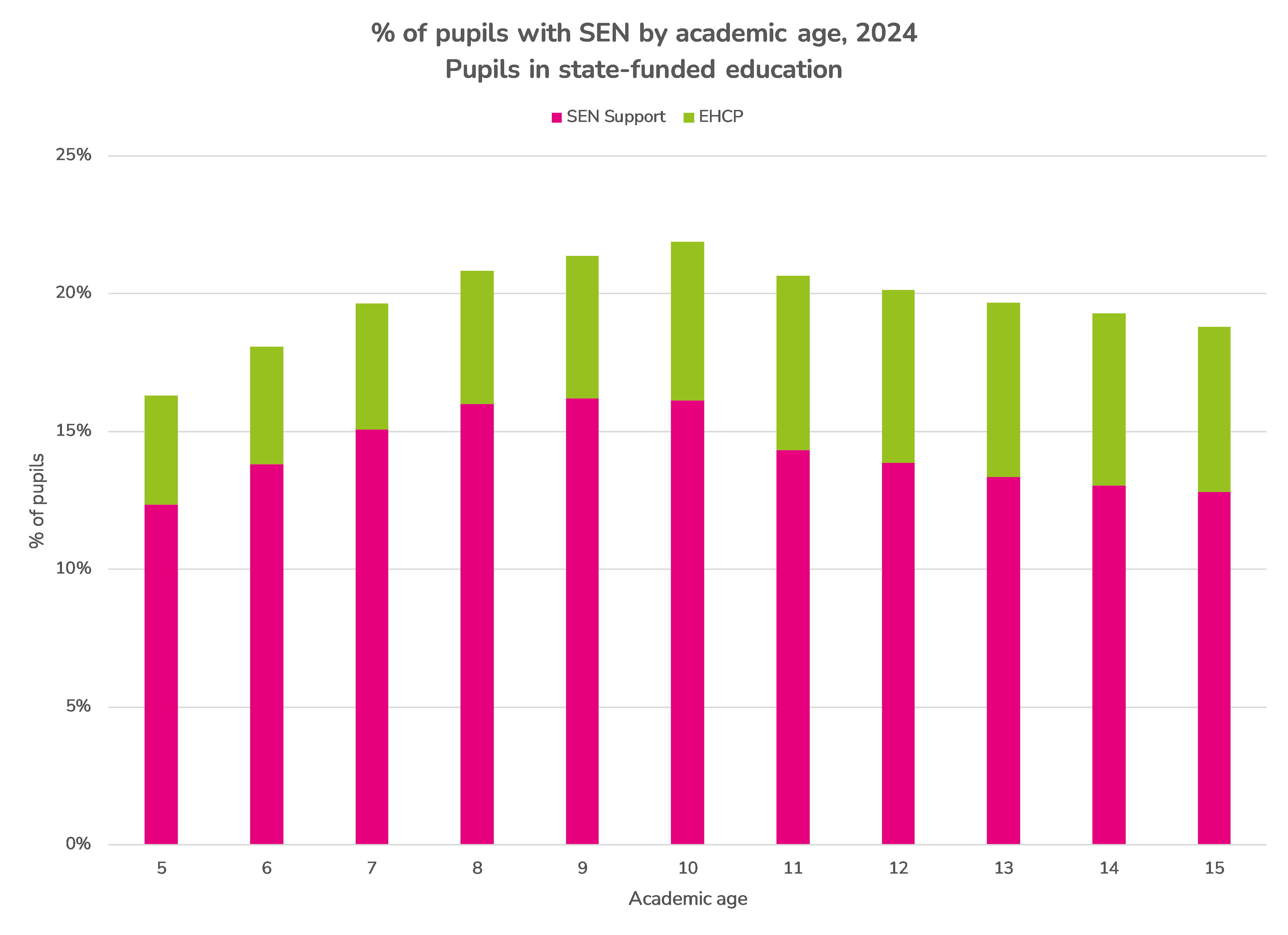 We show in the chart below the percentage of pupils with SEN by academic age in 2023/24. Rates were highest among pupils aged 10, which corresponds to Year 6.