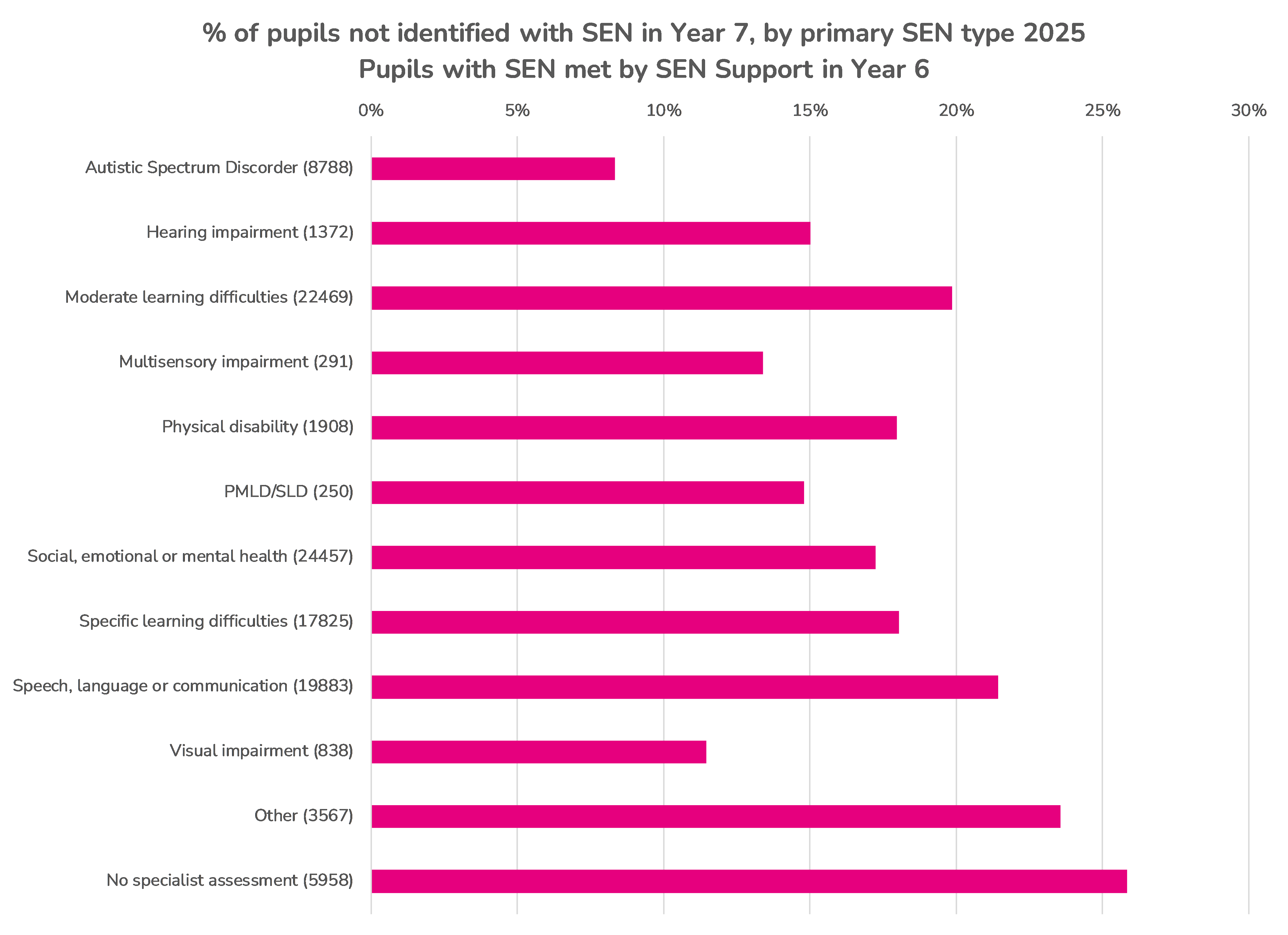 In terms of primary SEN types, those classed as “other” or “no specialist assessment” in Year 6 were the most likely to not be identified with SEN in Year 7.