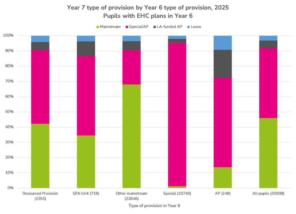 The majority of pupils with EHC plans recorded as attending a resourced provision or SEN unit in Year 6 left the mainstream sector in Year 7. However, the data on which pupils attend such provision, and indeed which schools offer such provision, is rather patchy at present.