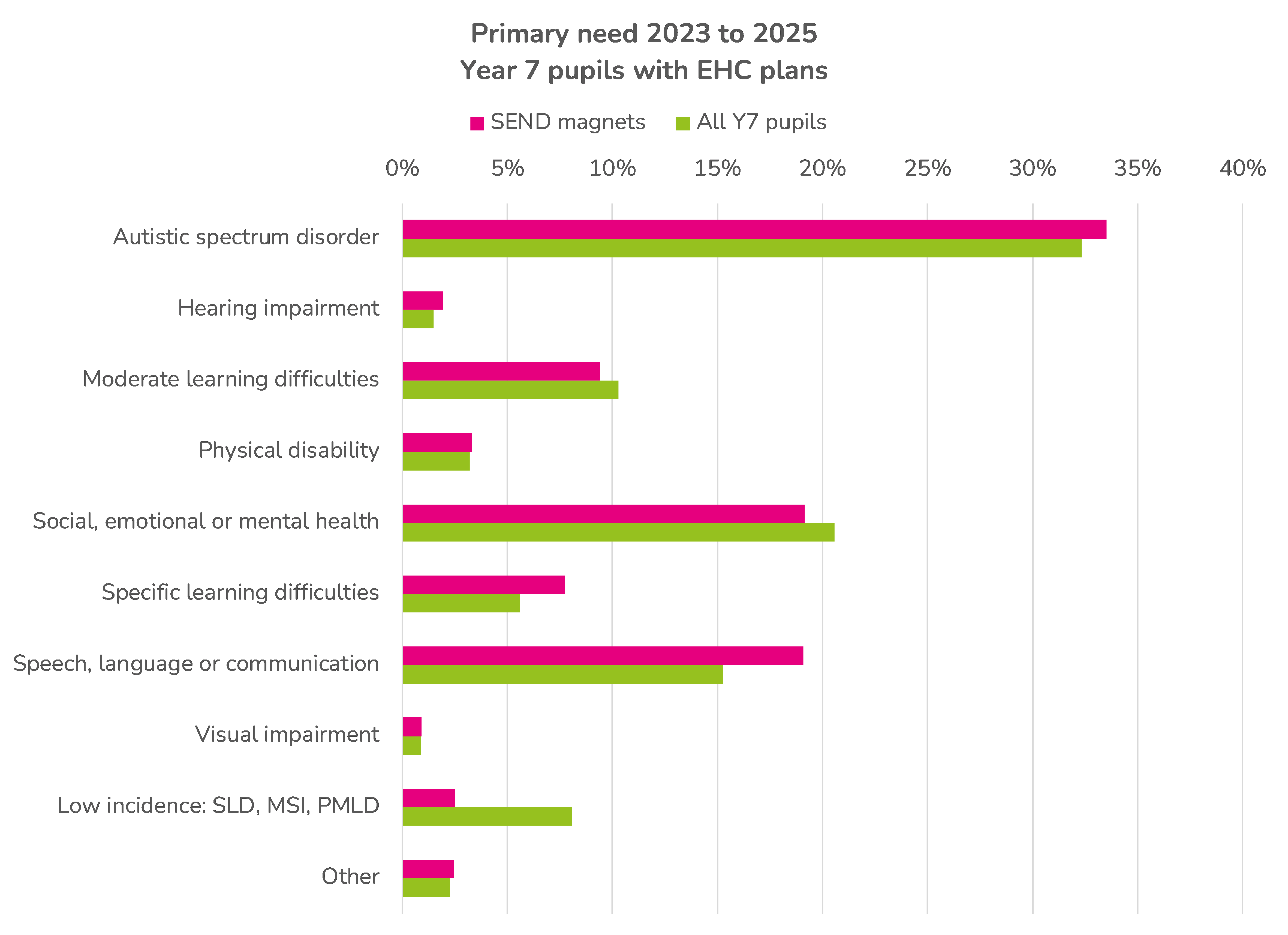 Of the 73 SEND magnet schools, 35 had Year 7 pupils recorded as attending a resourced provision or SEN unit. If specialist provision is available for pupils with SEN, it is perhaps unsurprising that these schools attract pupils with EHC plans.
