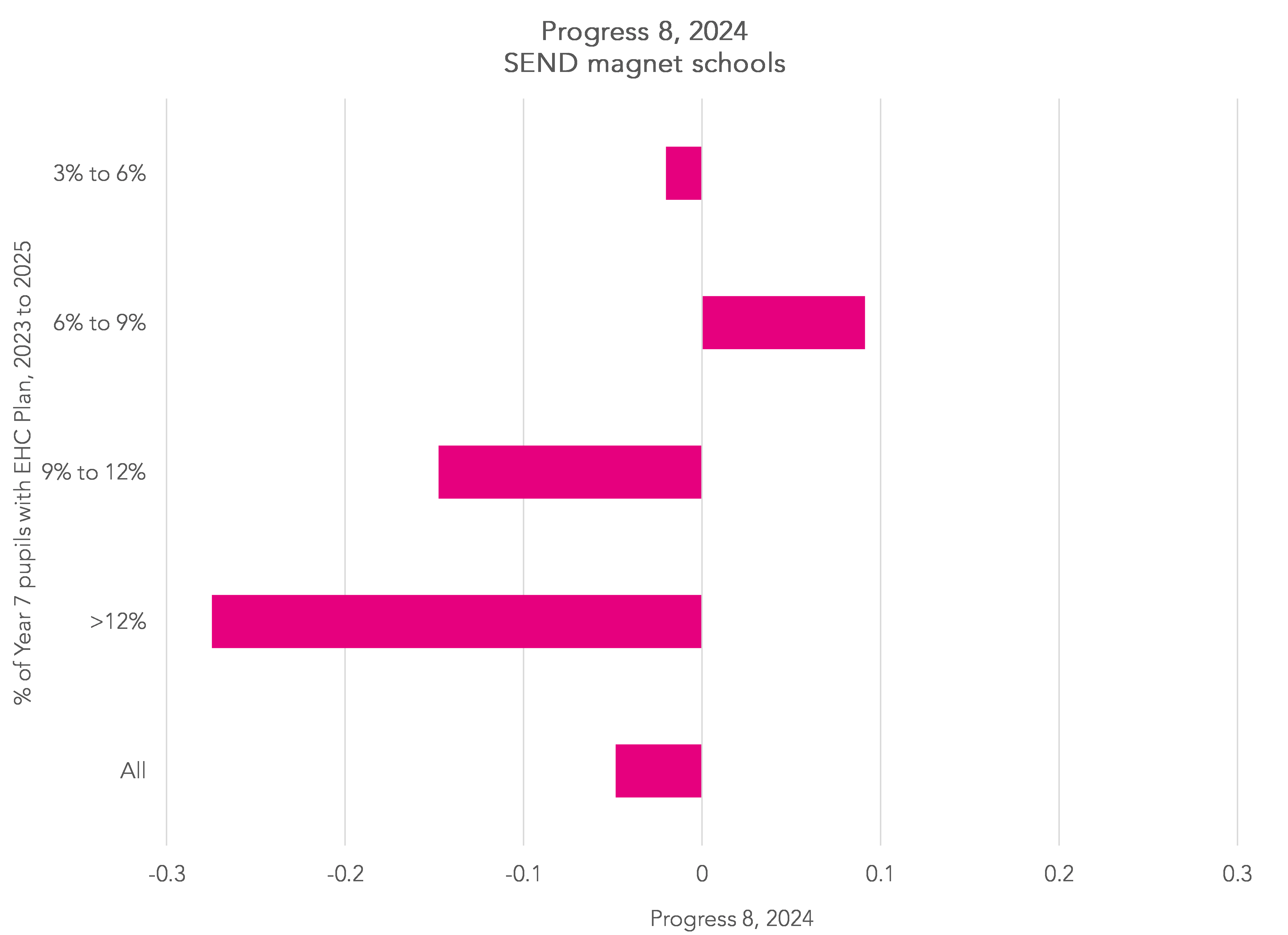 The SEND magnet schools with Year 7 EHCP rates above 9% tend to achieve negative Progress 8 scores. This perhaps highlights the current risk for secondary schools in becoming more inclusive.