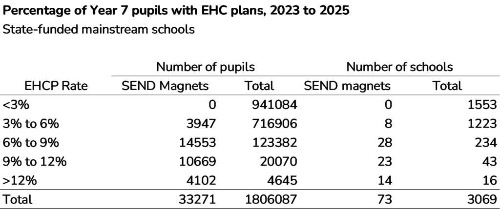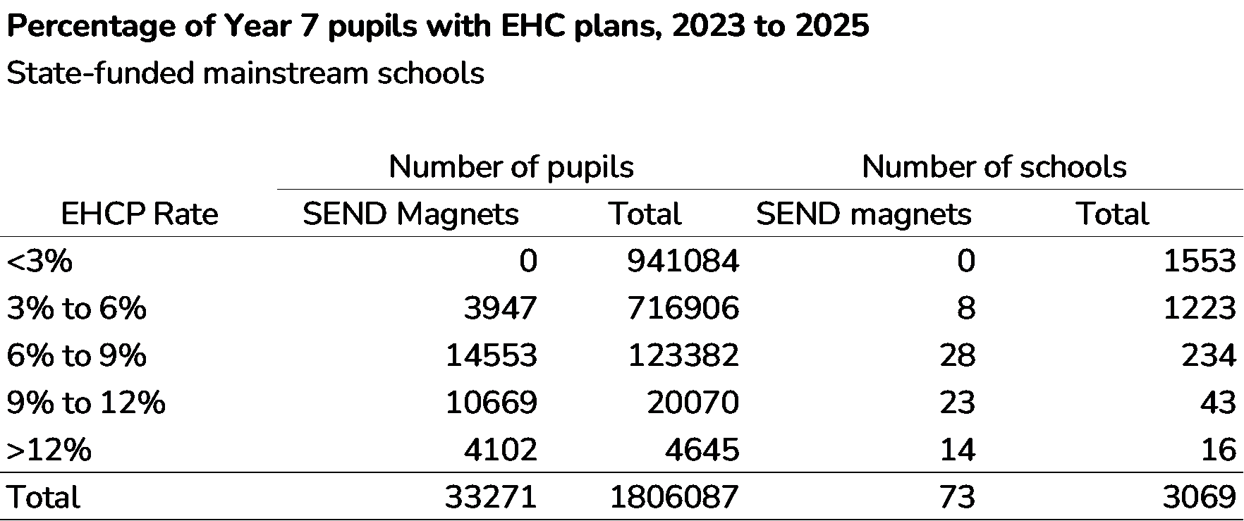 Finally, we identified a small number (73) of SEND magnet schools that admitted a far higher number of Year 7 pupils with EHC plans than we would expect given the prevailing rates in the areas where the schools were located.